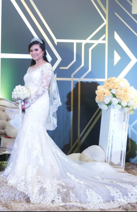 Bride Adinda - Long sleeves lace mermaid dress in ivory lace on champagne base