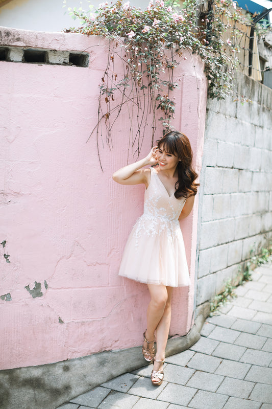 Bride Jenny - Pleated Blush Short Wedding Dress with Detachable Skirt
